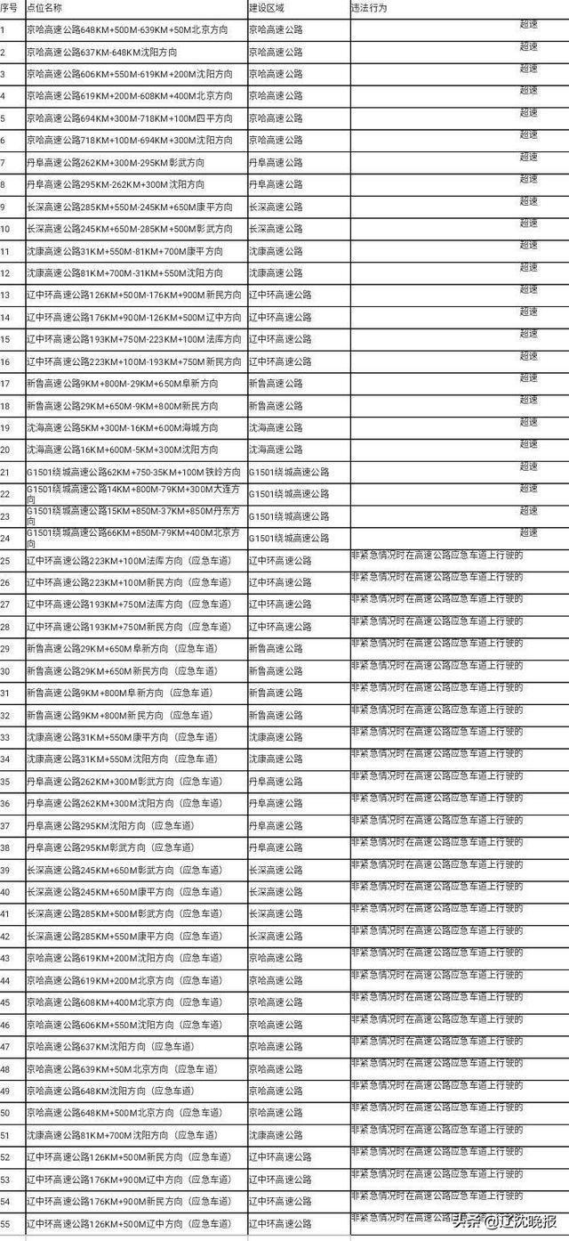 8月26日,沈陽市公安局交通警察局發(fā)布消息,為了更好的發(fā)揮科技設(shè)施在交通管理中的作用,進(jìn)一步規(guī)范行車秩序和行車安全,沈陽市新建“電子警察”55處。其中G1501繞城高速公路4處,丹阜高速公路6處, 京哈高速公路14處, 遼中環(huán)高速公路12處, 沈海高速公路2處, 沈康高速公路5處, 新魯高速公路6處, 長深高速公路6處。主要抓拍超速;非緊急情況時(shí)在高速公路應(yīng)急車道上行駛的交通違法行為。